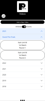 After the team has attending events, and uploaded videos, those videos can be viewed here. You can change the view between only showing videos per athlete, or videos for the entire team. Videos can be added using the “Add a New Video” button